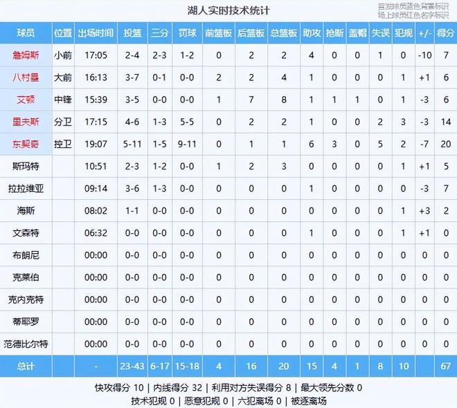 湖人(主队):东契奇20分1板6助3断、里夫斯14分2板1助、詹姆斯7分2板4助、拉拉维亚7分1助、艾顿6分8板1助、八村塁6分4板1助、斯玛特5分3板、海斯2分、文森特1助