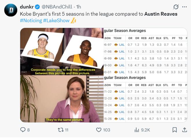 美媒晒出了里夫斯与科比生涯前五个赛季的数据变化,都是从场均7分一路攀升,生涯第五个赛季科比场均28.5分,里夫斯生涯第五个赛季28.1分相差无几。