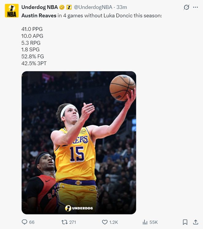 本赛季东契奇缺席的四场比赛,里夫斯场均41分10助攻5.3篮板1.8抢断,命中率52.8%,三分命中率42.5%,他完全可以当一支球队的第一核心,他个人进攻能力完全没有问题。