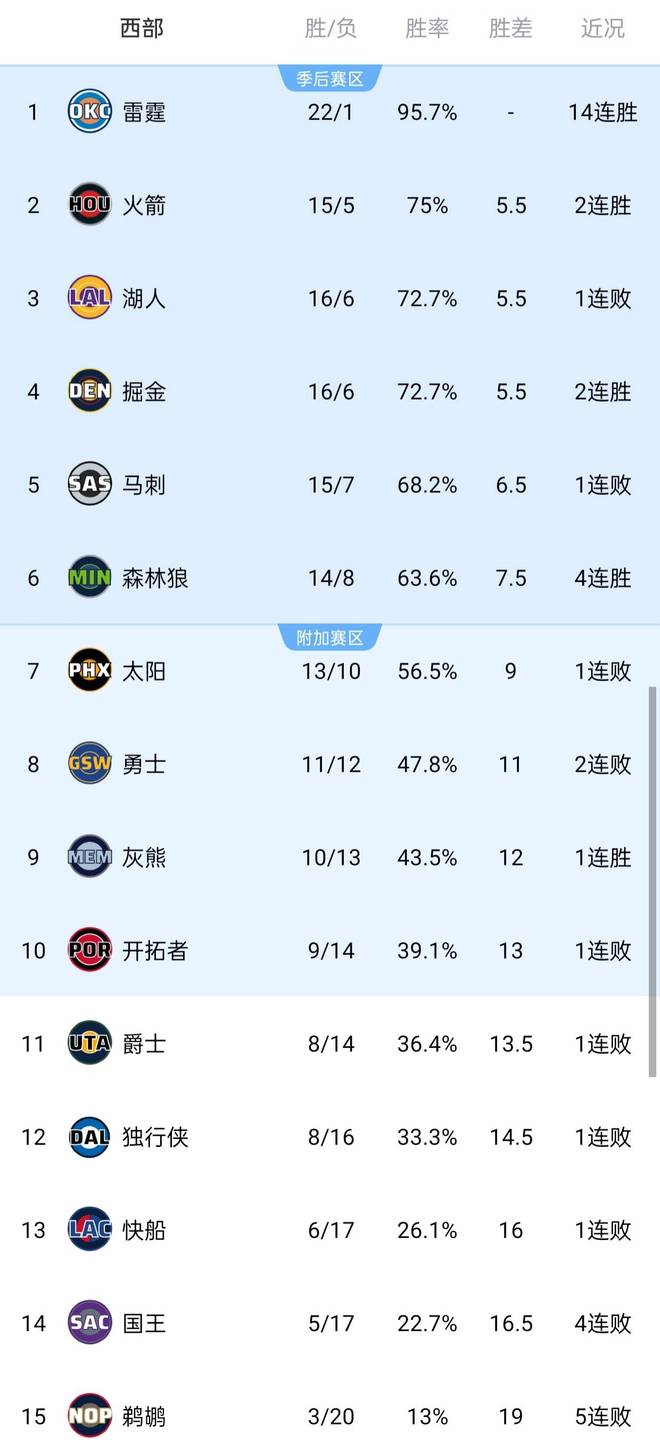 火箭2连胜反超湖人,雷霆14连胜,NBA西部最新排名如下,快船真惨