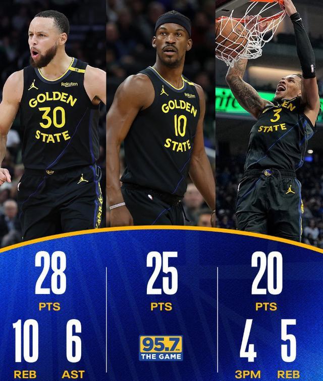 库里和巴特勒今天打得算是正常,库里19中10,三分11中4拿到28分10篮板6助攻;巴特勒从上一场开始就大幅增加了自己进攻端的侵略性,上一场打太阳拿到31分,今天又入账了25分。